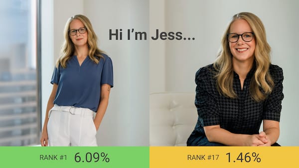 Of the 79 images I received from my personal brand photo shoot, I click-tested 21 of them and you can see my audience prefers the one on the left 300% more than the one on the right...