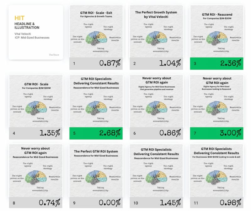 Here is a sample headline click-test with CTR results. Notice each of them have a different headline. And each of these pieces of creative ran as separate Facebook Ads to see which headline would get the ICP clicking the most.